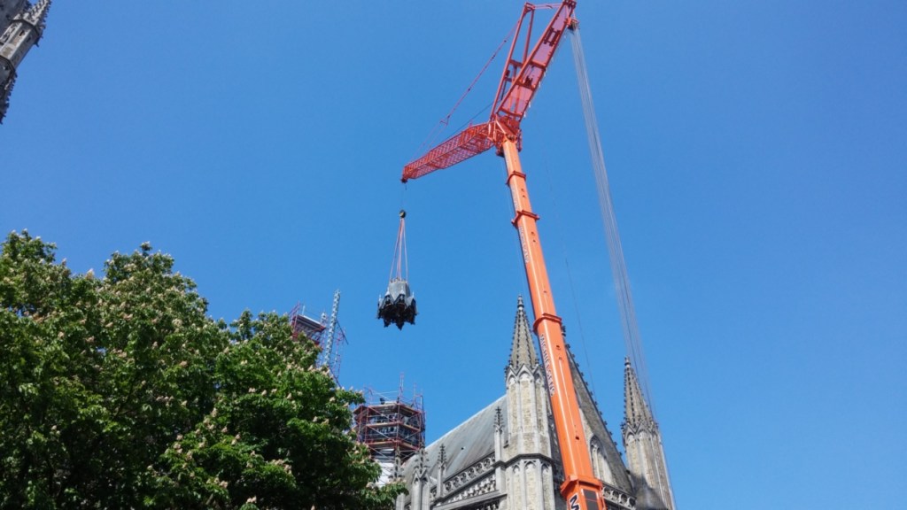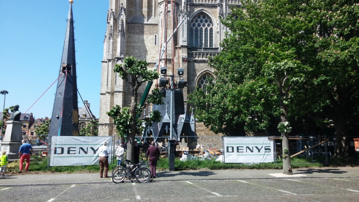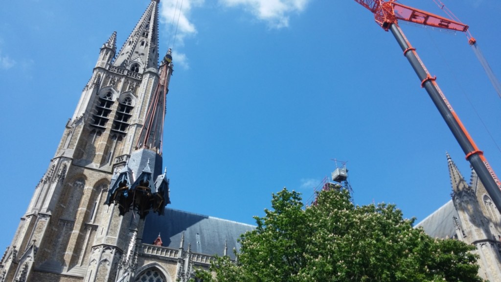 Op dinsdag 26 mei werden het onderste en middelste deel van de toren met een hijskraan van firma Michielsens opnieuw op hun plaats gehesen — een precisiewerk dat de aandacht van heel wat voorbijgangers trok.