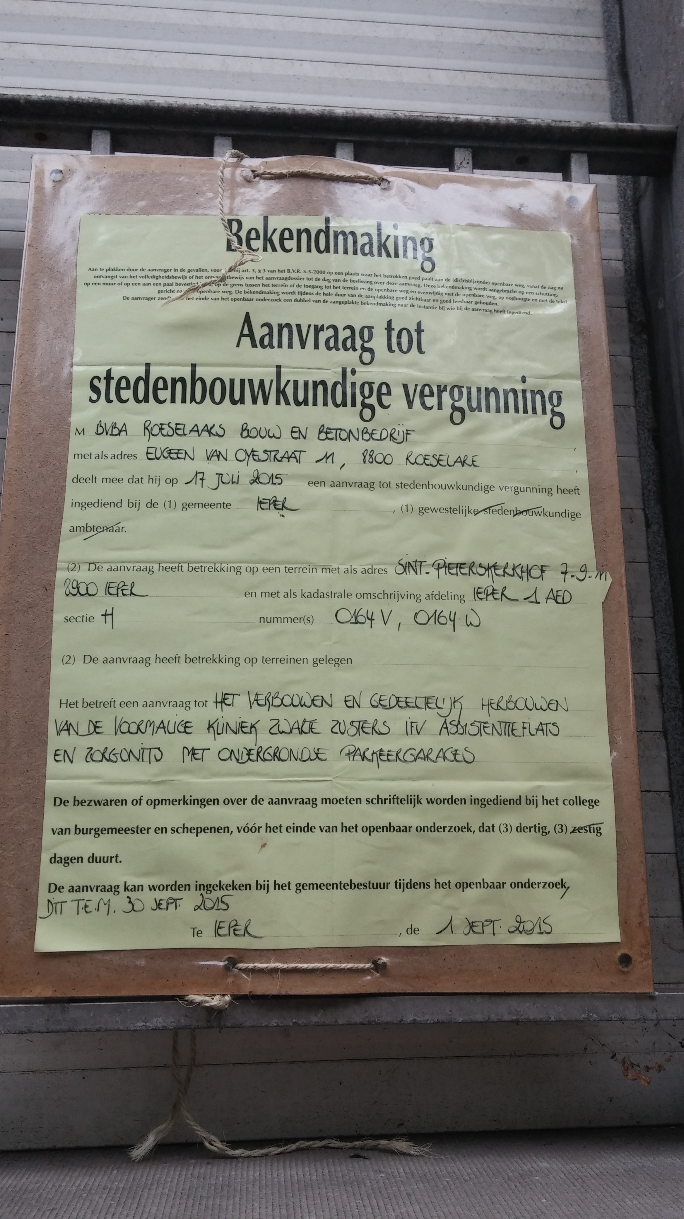 Op donderdag 17 september kregen de bewoners uit de omgeving wat meer uitleg over het project. Door “BVBA Roeselaars Bouw en Betonbedrijf” werd een bouwaanvraag ingediend om de vleugel met de oude ingang langs het Sint-Pieterskerkhof, gebouwd in 1965, te slopen en er een nieuwbouw te plaatsen met “assistentieflats en zorgunits” en 56 ondergrondse parkeerplaatsen. Het openbaar onderzoek van de bouwaanvraag loopt nog tot 30 september. Deze plannen wachten dus nog op goedkeuring van het stadsbestuur.