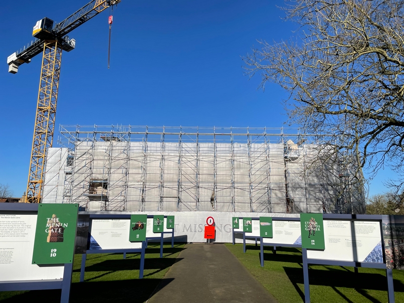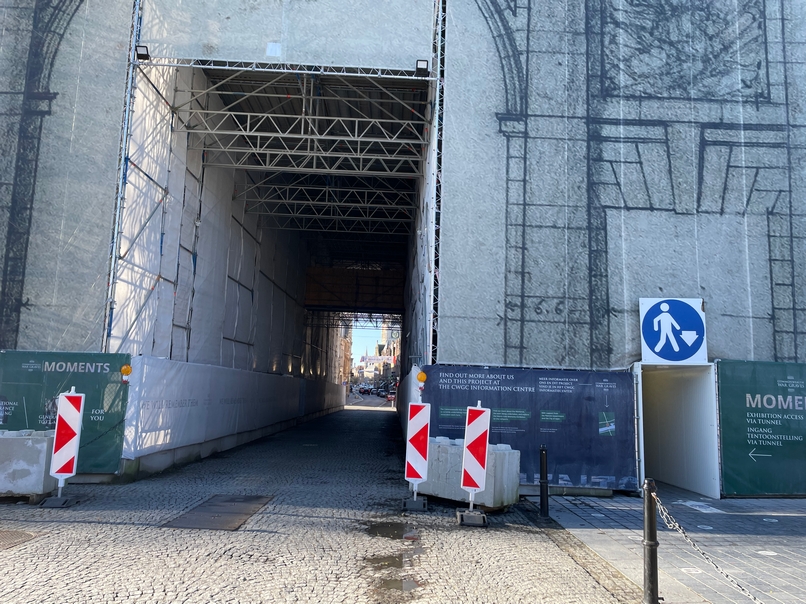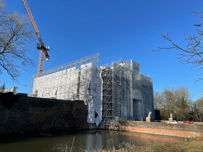 De stellingen op de werf werden ingepakt met stellingdoeken waarop een print van de originele schets van de Menenpoort in ware grootte te zien is. De schets werd in 1921 getekend door hoofdarchitect Reginald Blomfield. Het eerste plan van de poort was geïnspireerd op de Porte de la Citadelle uit Nancy.
