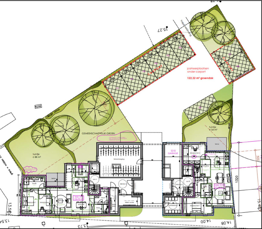 Op het gelijkvloers komt een centrale doorgang naar een achterliggende zone met parkeerplaatsen onder carports met een groendak van 122.32m², een fietsenberging en een groenzone (met tuintjes van 88m² en 54m²) . Er worden geen kelders voorzien. Het ontwerp is van Architecten Cottreel uit de Westkaai en de bouwheer is Pyloon BV uit Izegem.