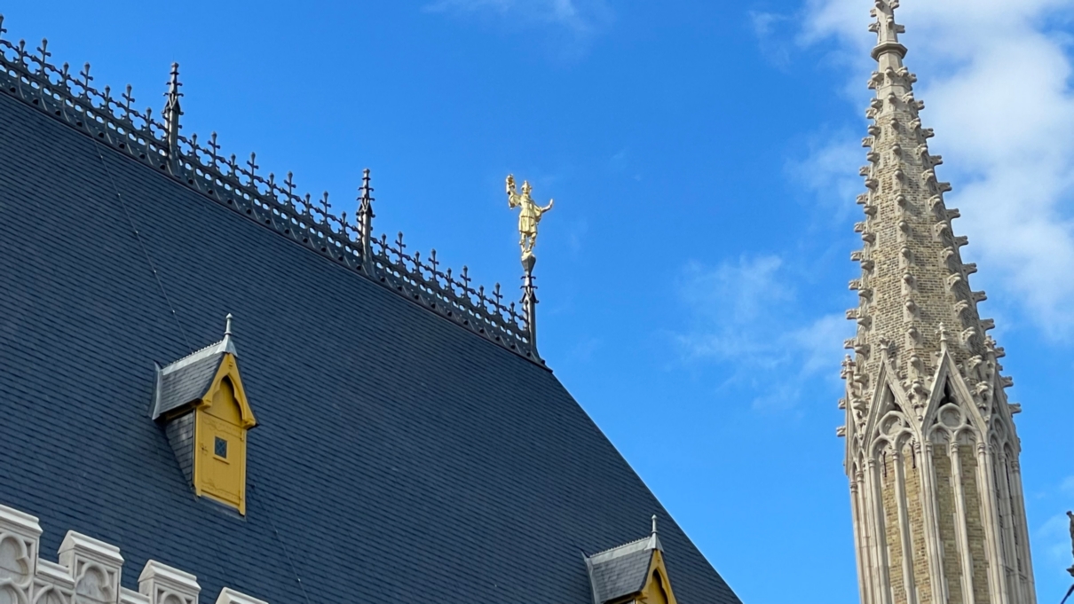 Ieper – Vorige week (juni 2024) werd het gouden (koperen) beeld van de stadsnar terug naar zijn vertrouwde plek op het dak van de Lakenhallen aan de kant van het Nieuwerck geplaatst. Het iconisch beeld werd eerder van de Lakenhallen gehaald door de restauratie van het werelderfgoed en kreeg zelf ook een opknapbeurt: het werd helemaal opnieuw verguld.