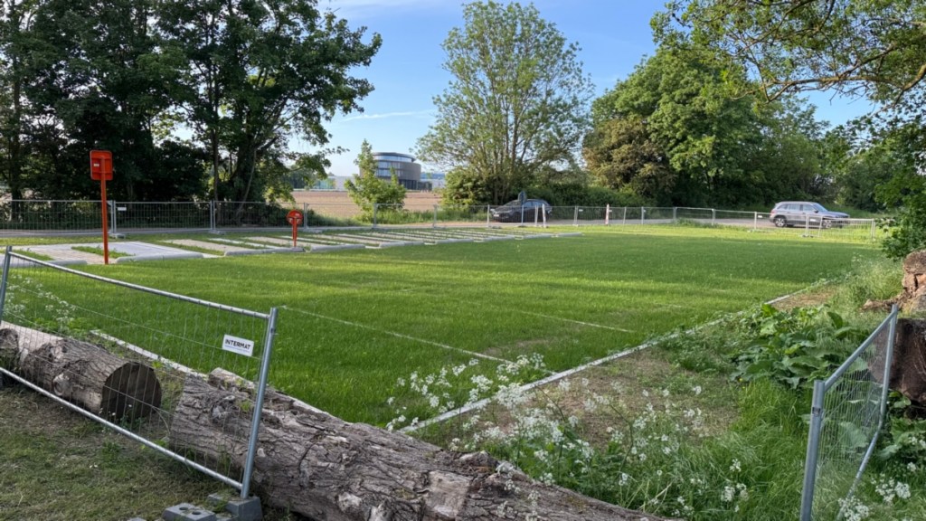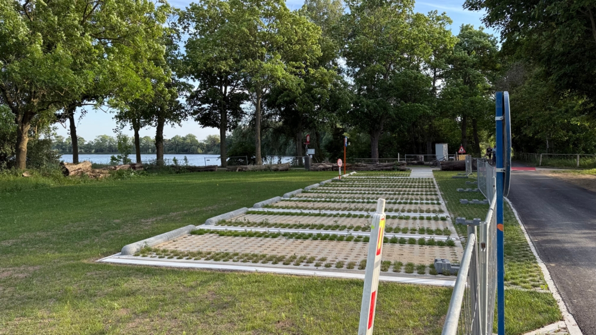 De parking is aangelegd met geperforeerde betonplaten, deels gevuld met teelaarde en deels met zavel. Dat zorgt ondergronds voor een geschikte nestplek tot wel 55 centimeter diep, terwijl het oppervlak stevig en waterdoorlatend blijft – perfect om voertuigen veilig te parkeren.