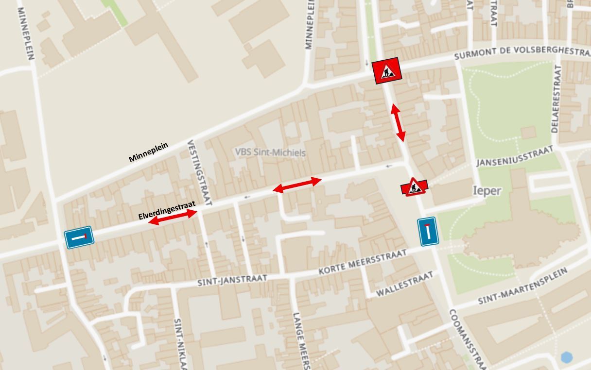 Boezingepoortstraat en Herejanstraat: tijdens de werken enkel bereikbaar via de Elverdingestraat, waar dus uitzonderlijk tweerichtingsverkeer geldt.