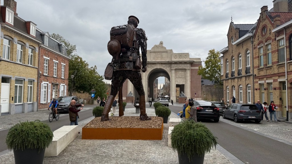 Sinds dinsdag heeft de omgeving van de Menenpoort er een opvallende bezoeker bij. Het monumentale kunstwerk The Hauntings, een 6,5 meter hoge figuur van een WOI-soldaat, werd er zorgvuldig in elkaar gezet. De sculptuur bestaat volledig uit onderdelen van oude machines en wagens en trekt onmiddellijk de aandacht van voorbijgangers.
