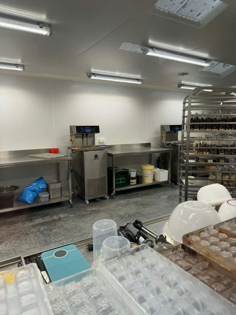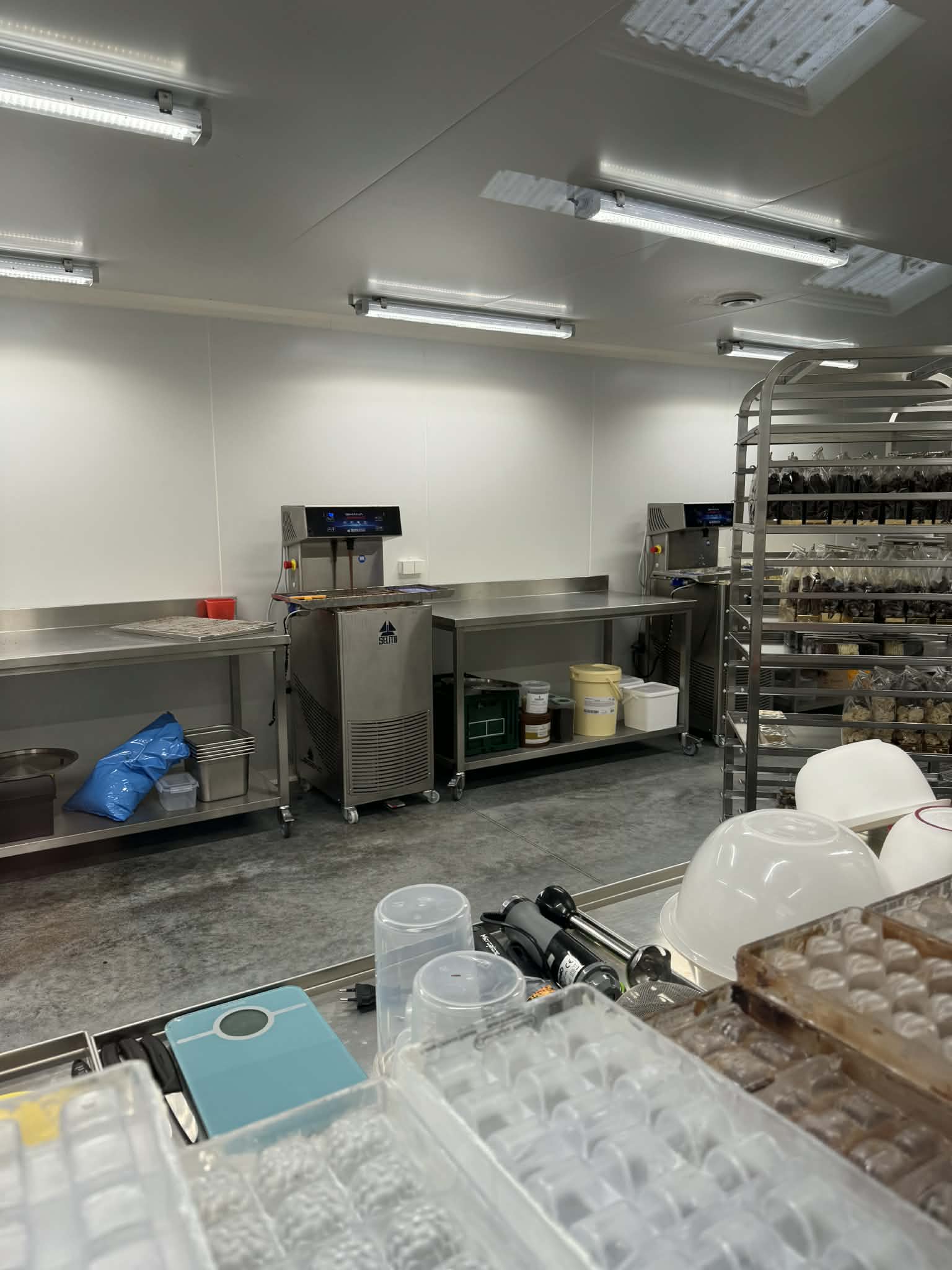 Het atelier werd uitgerust met onder meer drie tempereermachines, waardoor professioneel en op kleine schaal kan worden gewerkt. Zo kreeg de ruimte een tweede leven, dit keer in dienst van chocolade in plaats van hout.
